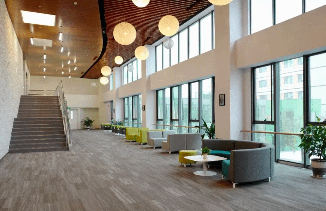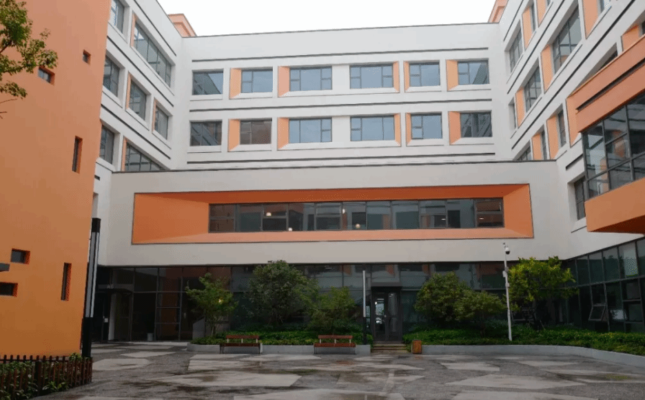 校舍占地117亩,用不同的颜色来区分教学楼。楼下的绿化除了装点了校园的美,也被外教用作户外教学。