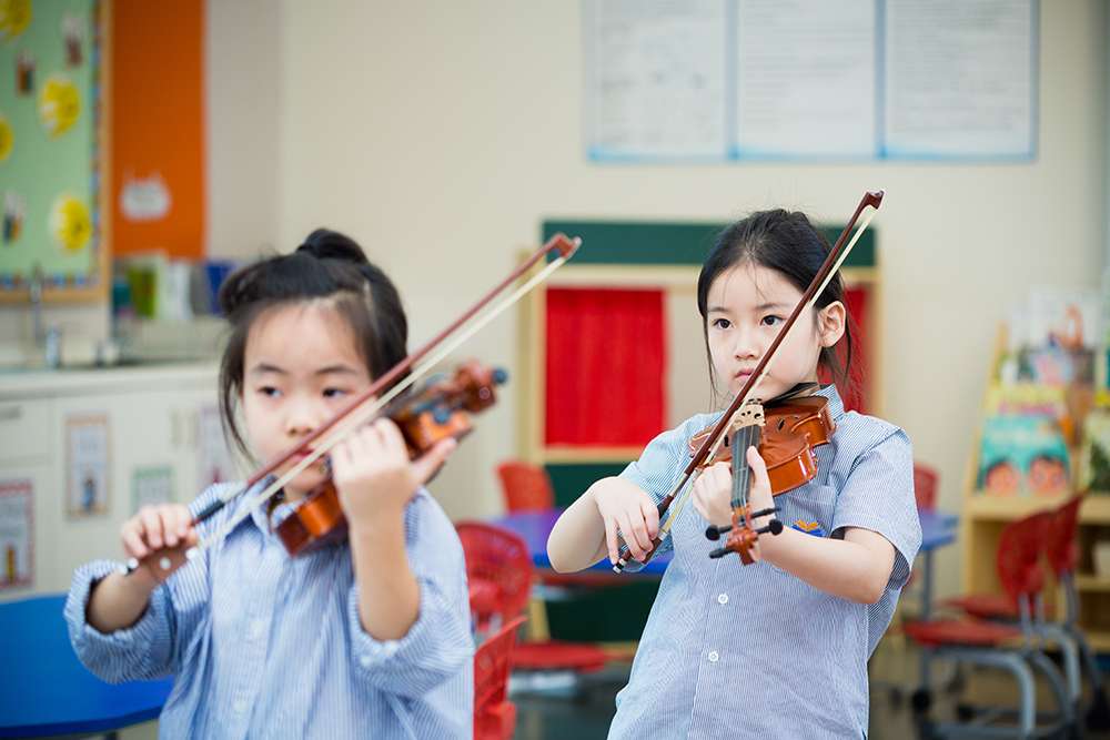 从幼儿园开始到小学三年级,学校开设了小提琴必修课。初期学习乐理知识,后期逐步增加课程量和难度。到小学阶段,除了常规的音乐课,每周都有两节小提琴课。