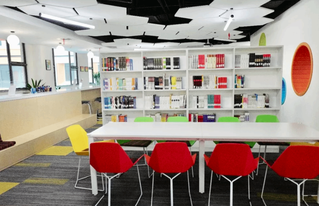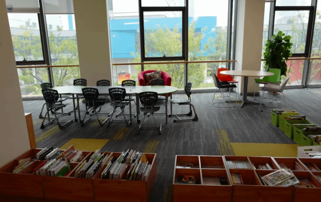 桐乡校区的整个校园是有美国著名的Fielding Nair International(FNI) 公司负责主创设计的。在这个融合了中西方文化和多个年龄段的校园里,可以看到学习和生活的和谐融洽。拿阅览区来看,这里既有适合大孩子的自习区域,也有适合低龄孩子的阅览区。