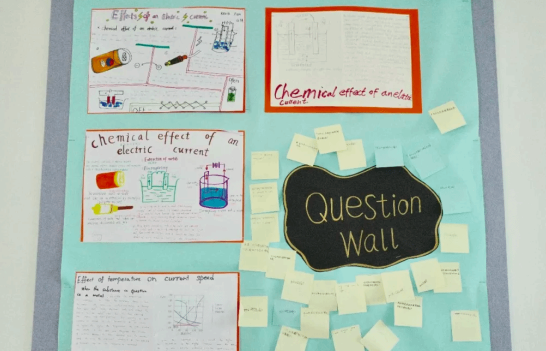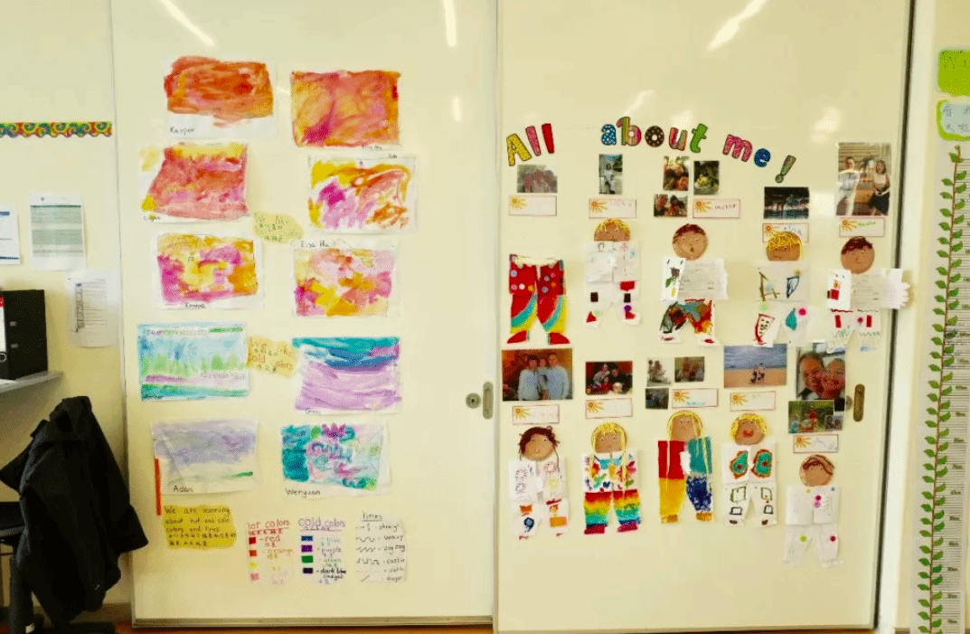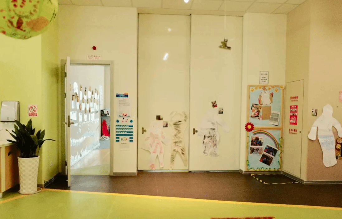 各个年级的教室都有一扇“活动门” ,可以当作“墙”,来张贴孩子的作品,可以作为“白板”,及时写下头脑风暴之后的点子;当然,它也是扇可以打开的门,随时扩大教室的活动空间。