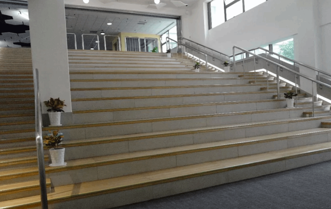 这也是国外课堂很常见的阶梯教室,日常它就是一个宽敞的楼梯。但需要的时候,它正对的墙可以用作大投影屏幕,前方的空地就是舞台,孩子可以就地而坐,把这里当剧场。