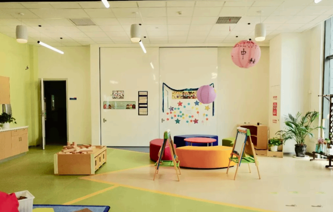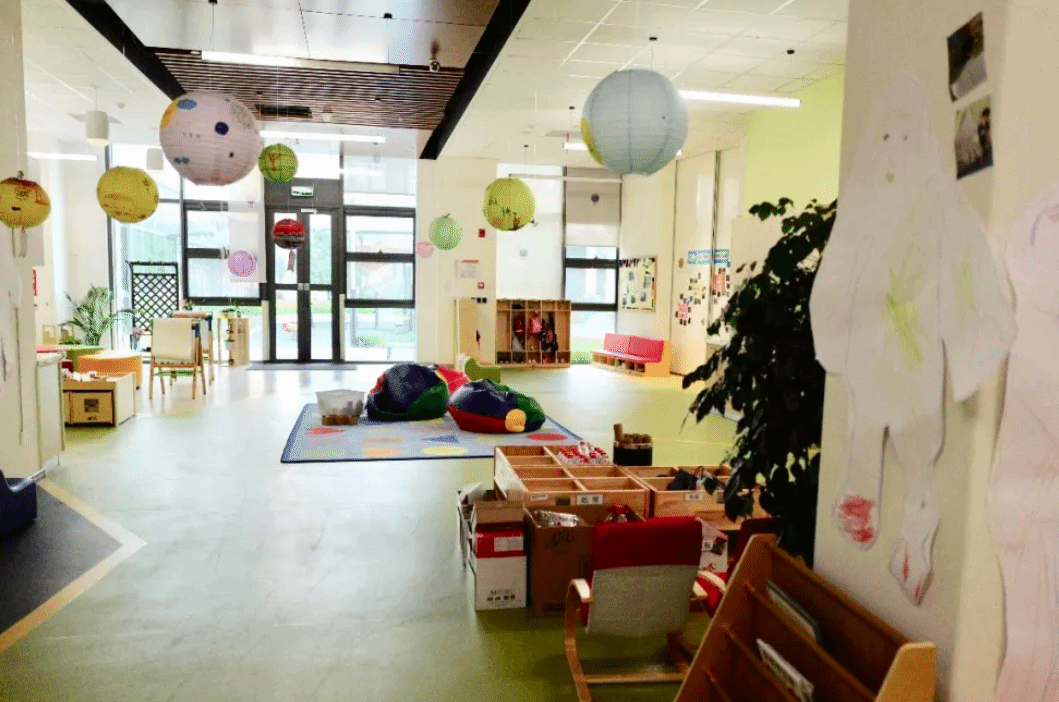 幼儿园教室都在一楼,四周都是大落地玻璃窗。即便是探校日这样的阴雨天,教室依旧很明亮。明亮也源自教室的宽敞,区角分布在各个角落,给孩子留下足够的活动空间。