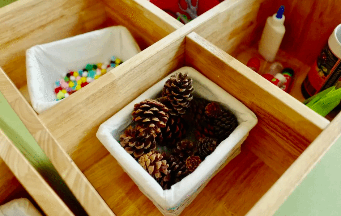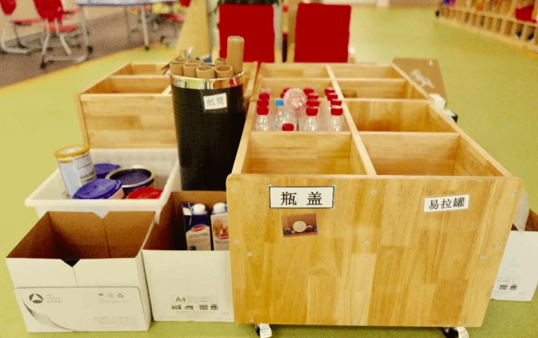 在中西融合的理念之下,耀华的教室里可以看到很多双语的元素。幼儿园部是双教师制,每个班都有一名中教和一名外教全天同时在班。教学用的素材很多都源自生活——收集回来的松果、各种材质的罐子器皿。
