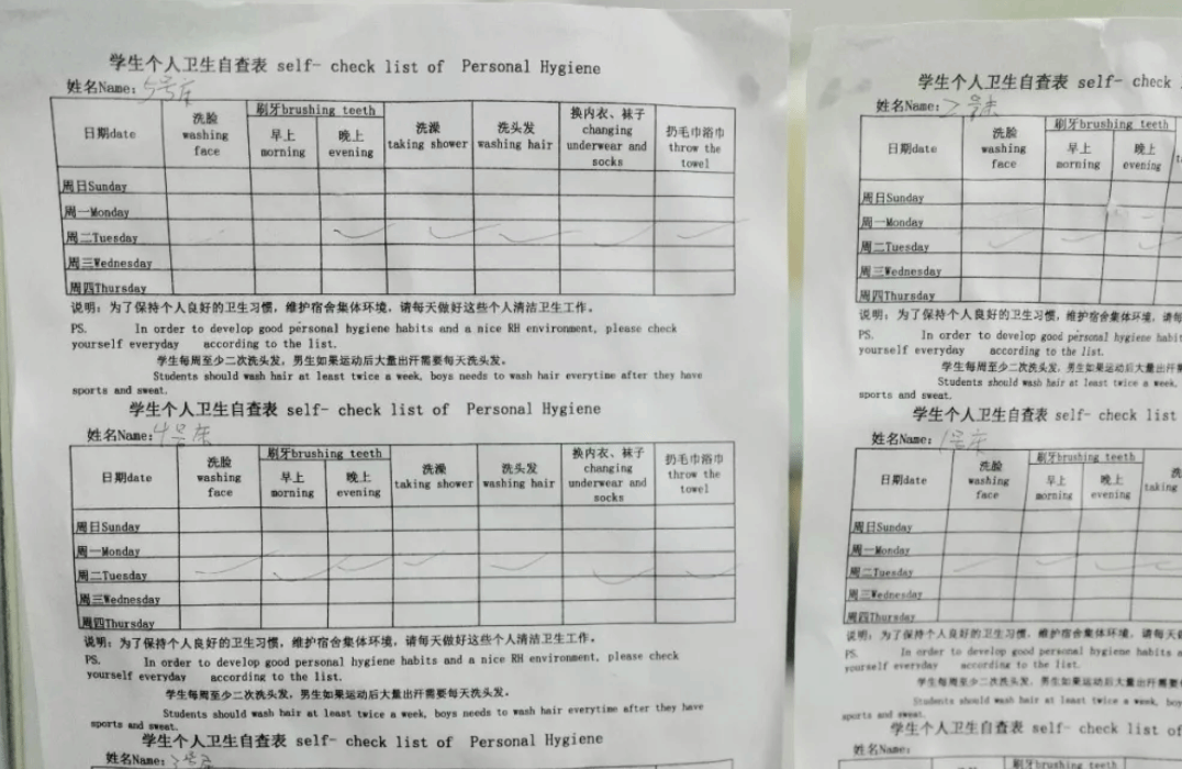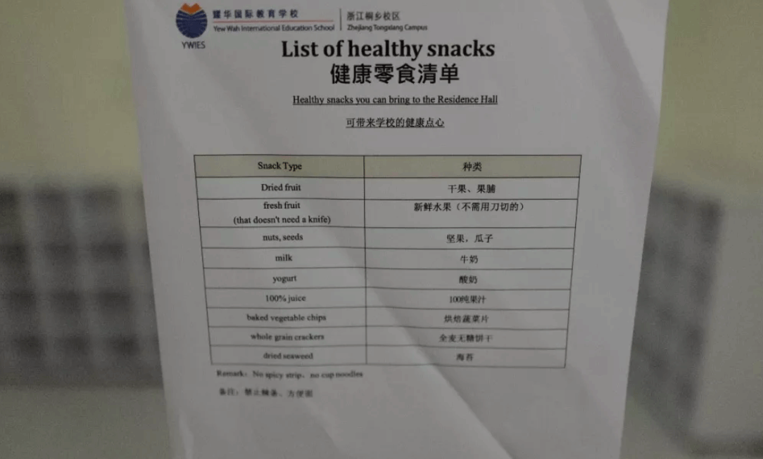 寝室的洗手间都有一张“个人卫生自查表”,在校的日子里要确认是不是都按要求完成了。寝室管理是有的放矢,比如零食可以带,但必须是“健康零食”。不能随意在卧室吃,更不能带去教学区,需要存放在“零食储藏室”。架子里有收纳盒,每个学生贴上自己的名字,把零食储存在里面。可以在休息区域活动的时候,取出来吃。