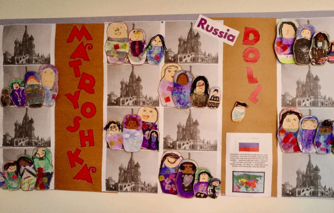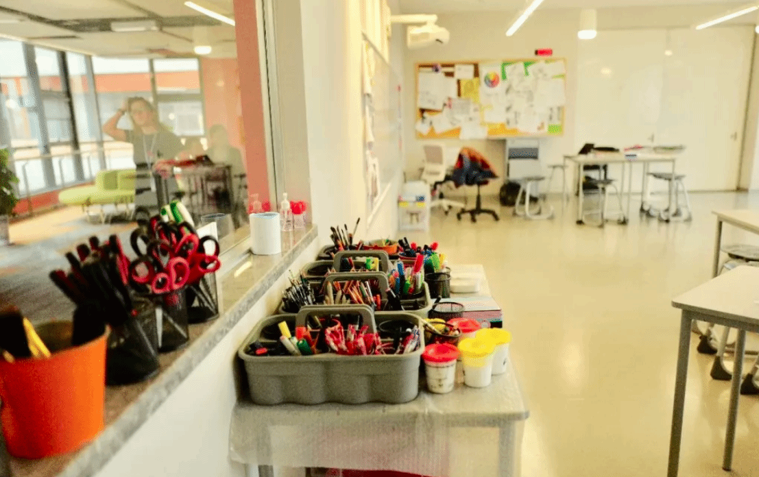 除了小提琴和戏剧的必修课,学校亦重视培养学生各方面的艺术能力。美术课程也是外籍教师授课,教室里摆放了丰富的各式材料和学生作品,楼道的墙上贴上不同年龄段孩子的美术和设计作品。