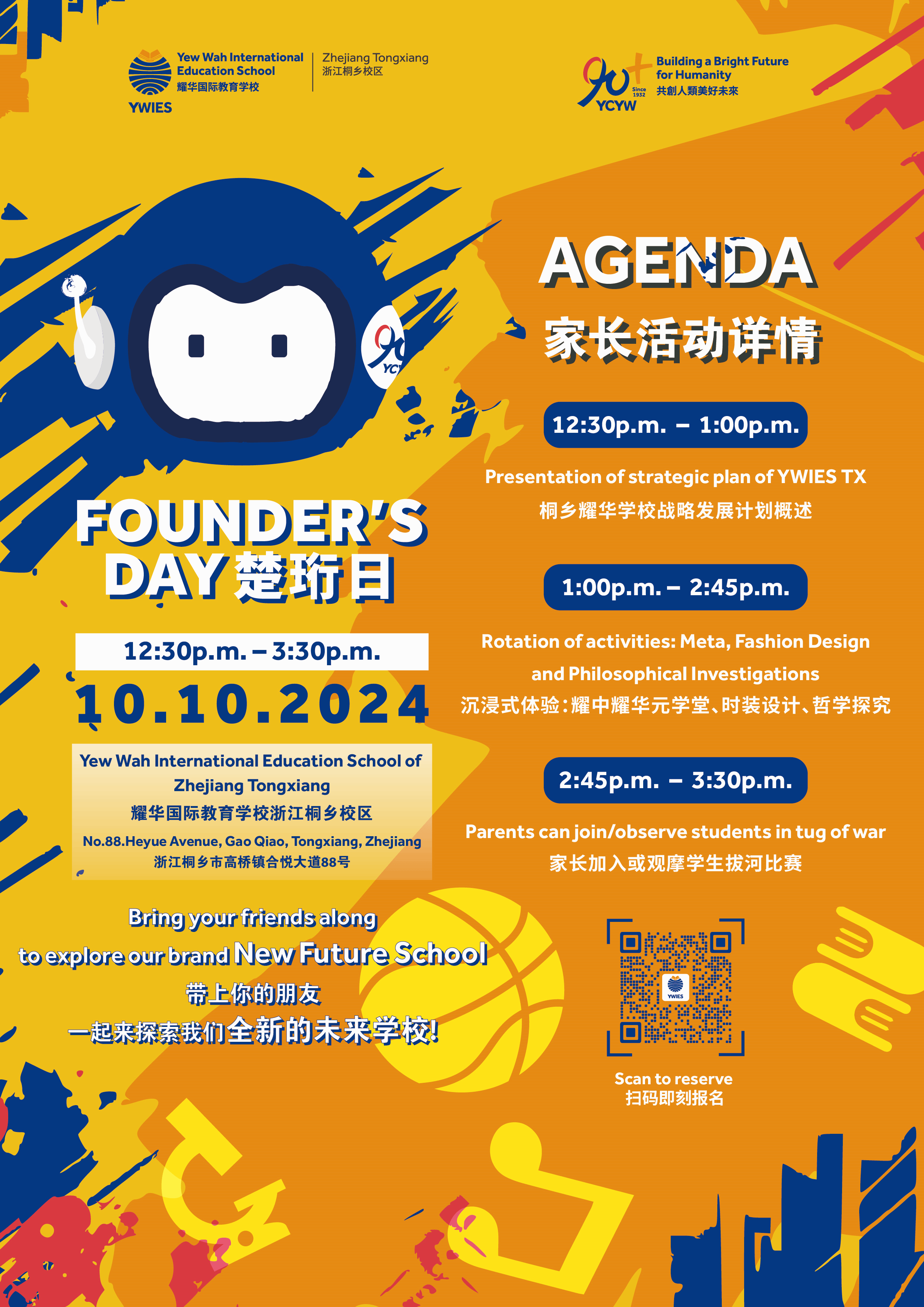 We sincerely invite you, your family, and friends to join us at this grand event where education innovation and dreams set sail. At YWIES Tongxiang, a land full of infinite possibilities, you will explore the school's innovative learning spaces, experience the charm of cutting-edge educational programmes, and witness the dawn of a new era in education.