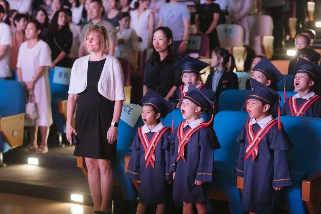 毕业典礼上表演出了意外,让于老师看到更多“成长的惊喜”。英文朗诵部分刚结束,播放设备突发故障,提前录制的伴奏声停了下来。舞台上短短几秒的静默后,孩子处变不惊,一旁的主持人老师适时递来话筒扩音,让他们自然地接续朗诵。毕业仪式圆满完成,小朋友才激动地偷偷抹泪。