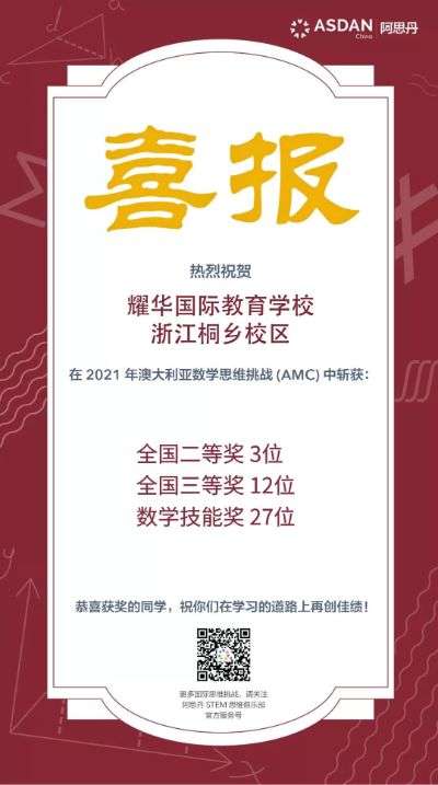 本次澳大利亚数学思维挑战赛,上至高中下至小学三年级,共有42名桐乡耀华学生参赛。最终成绩发布后,三位获得全国二等奖,十二位获得全国三等奖,二十七位获得数学技能奖。具体战报如下: