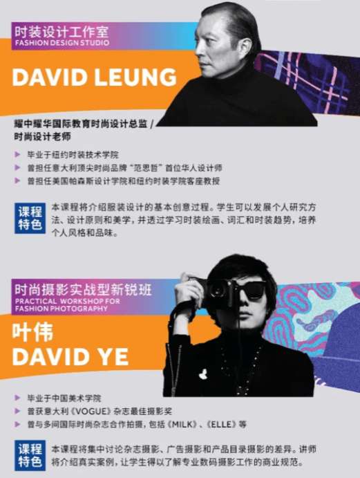 本次的“时尚设计及摄影”短期课程也被称之为“大师班”。桐乡耀华有幸请到耀中耀华时尚设计总监,曾担任国际知名品牌“范思哲”设计师的David Leung先生,以及曾获领域权威媒体《VOGUE》杂志最佳摄影奖的著名时尚摄影师叶伟先生,这两位行业顶尖级大师作为授课导师。