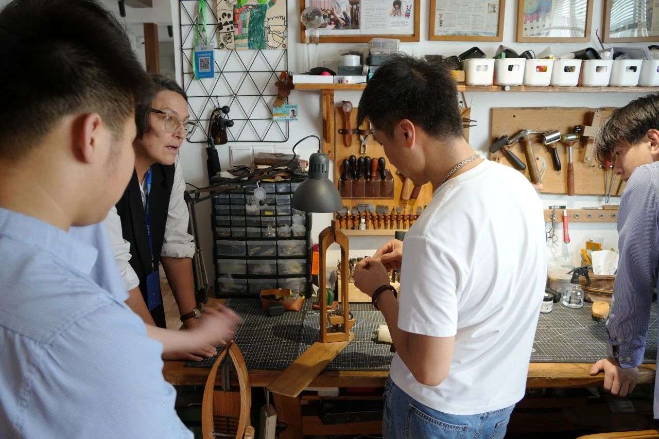 在工匠老师的介绍下,同学们深入了解了皮革制品的制作流程和相关知识,工匠老师还详细讲解了皮革的来源、加工、设计以及生产,并现场展示了切割、缝制和打孔等技艺。