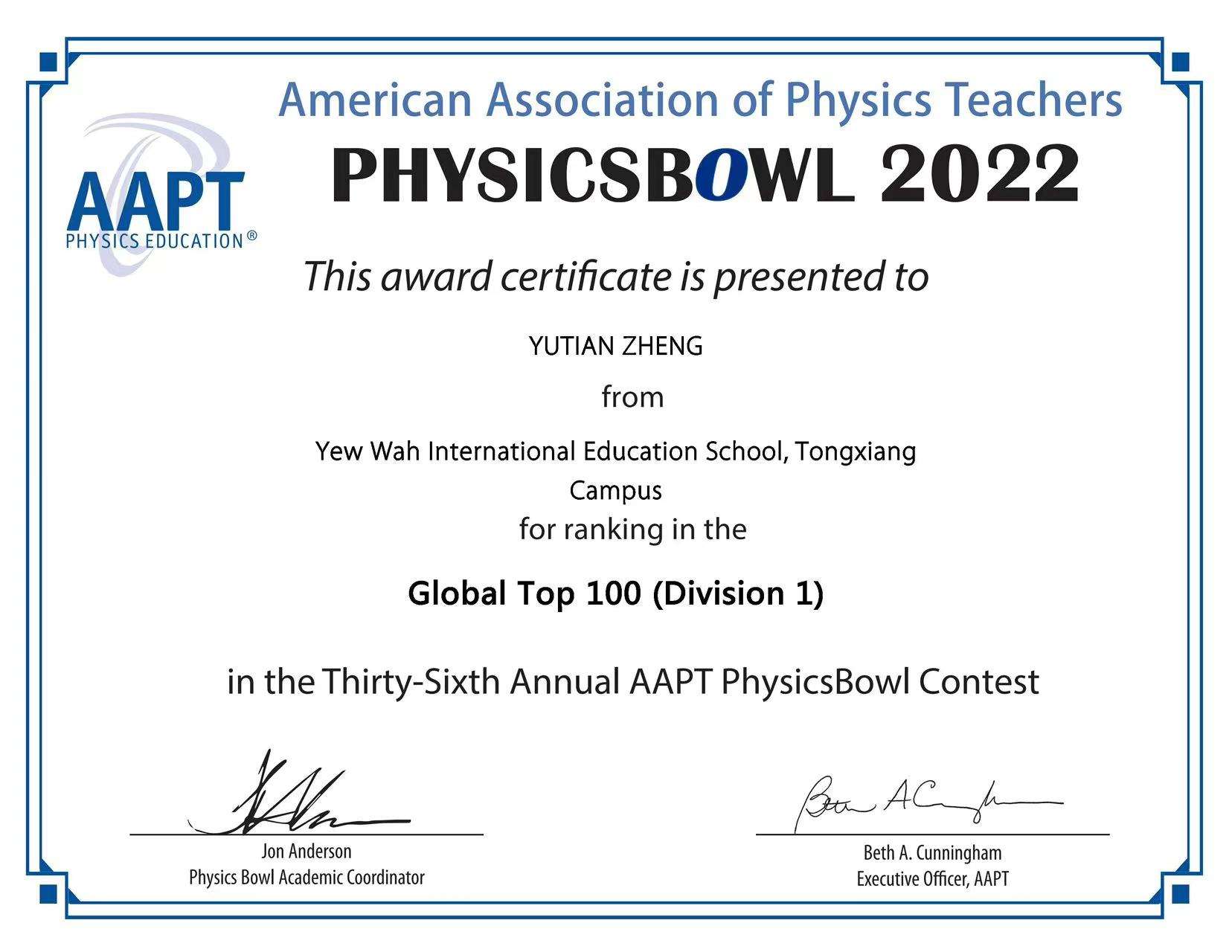 作为全面发展的耀华学子,他积极参加各种学术竞赛,曾获得美国物理碗(AAPT PhysicsBowl)全球金奖,澳大利亚数学思维挑战(AMC)全国三等奖等:
