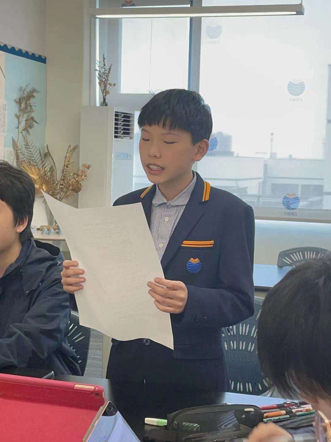 4月20日上午09:40-11:00,辩论赛正式如期举行。桐乡耀华7、8年级对阵广州耀华。8名辩手带着各自的准备,从对辩题的拆解,观点的论证,表达出己方对于“伟业是什么”、“什么样的牺牲是重大牺牲”、“个体与群体的利益孰轻孰重”以及“牺牲与伟业如何衡量”等等价值观的思考。在言语的交锋中,在价值观得碰撞中,双方辩手尽展自己的理解。赛后,来自广州耀华的资深辩手陶律天(广州耀华辩论社社长)从专业辩手的思辨模式、思考角度、分析深度等方面对比赛进行了专业精到的点评,将同学们对于论辩的认识提升了一个高度。