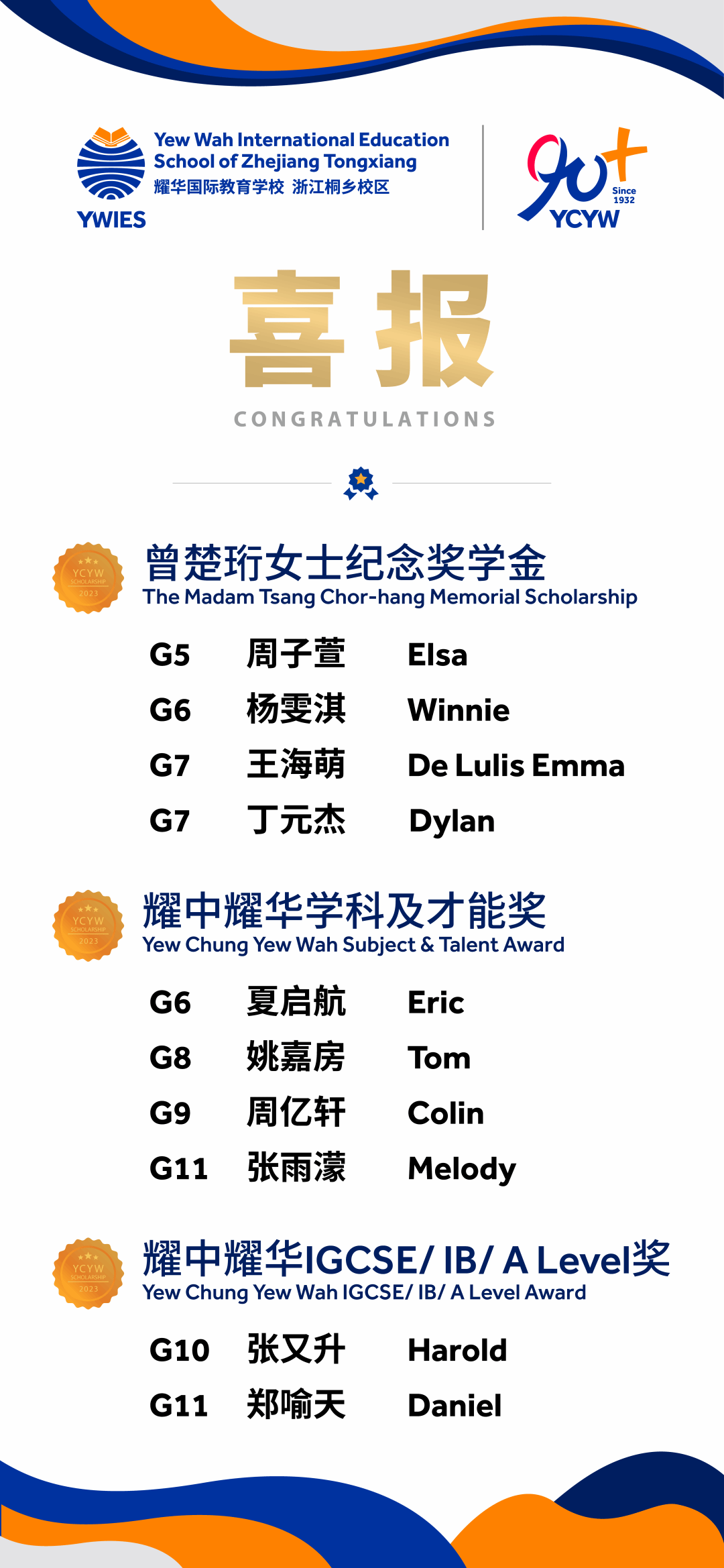 耀中耀华奖学金计划旨在表扬学生在学术成就、领导力和服务方面的出色表现,奖励来自世界各地、积极进取且富有才华的优秀学生。近日,耀中耀华奖学金名单正式公布,桐乡耀华10位优秀的学子榜上有名。