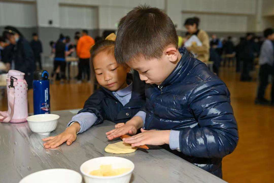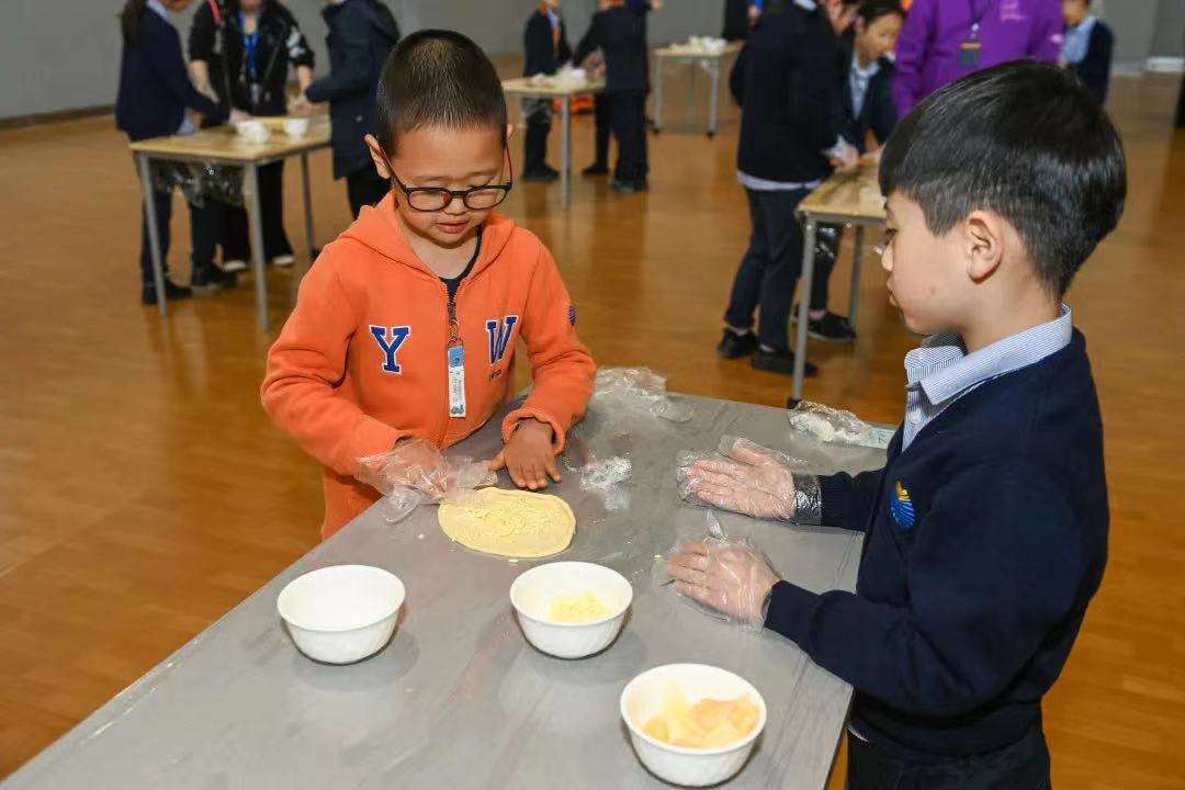为了制作一个“又圆又大”的披萨,有的同学拿手摁,有的拿擀面杖擀,还有的几个人一起扯,每个同学都沉浸在制作披萨的乐趣中。