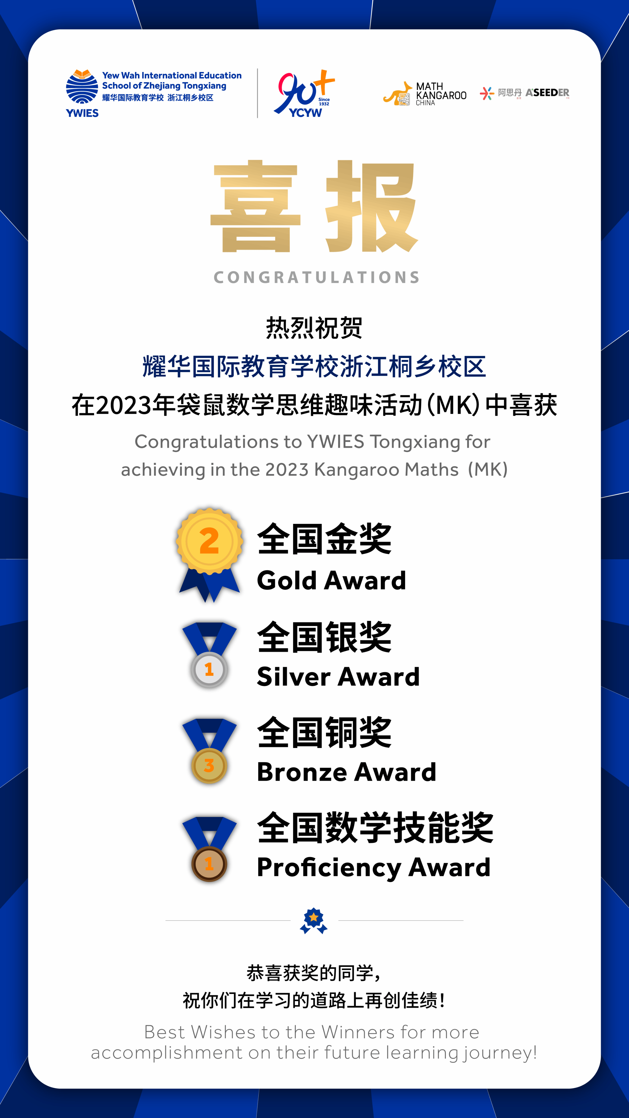 近日,阿思丹(香港)举办的 “2023年袋鼠数学思维趣味活动”最终成绩已经揭晓,桐乡耀华7名学子载誉而归。其中2个全国金奖,1个全国银奖,3个全国铜奖,1个全国数学技能奖。