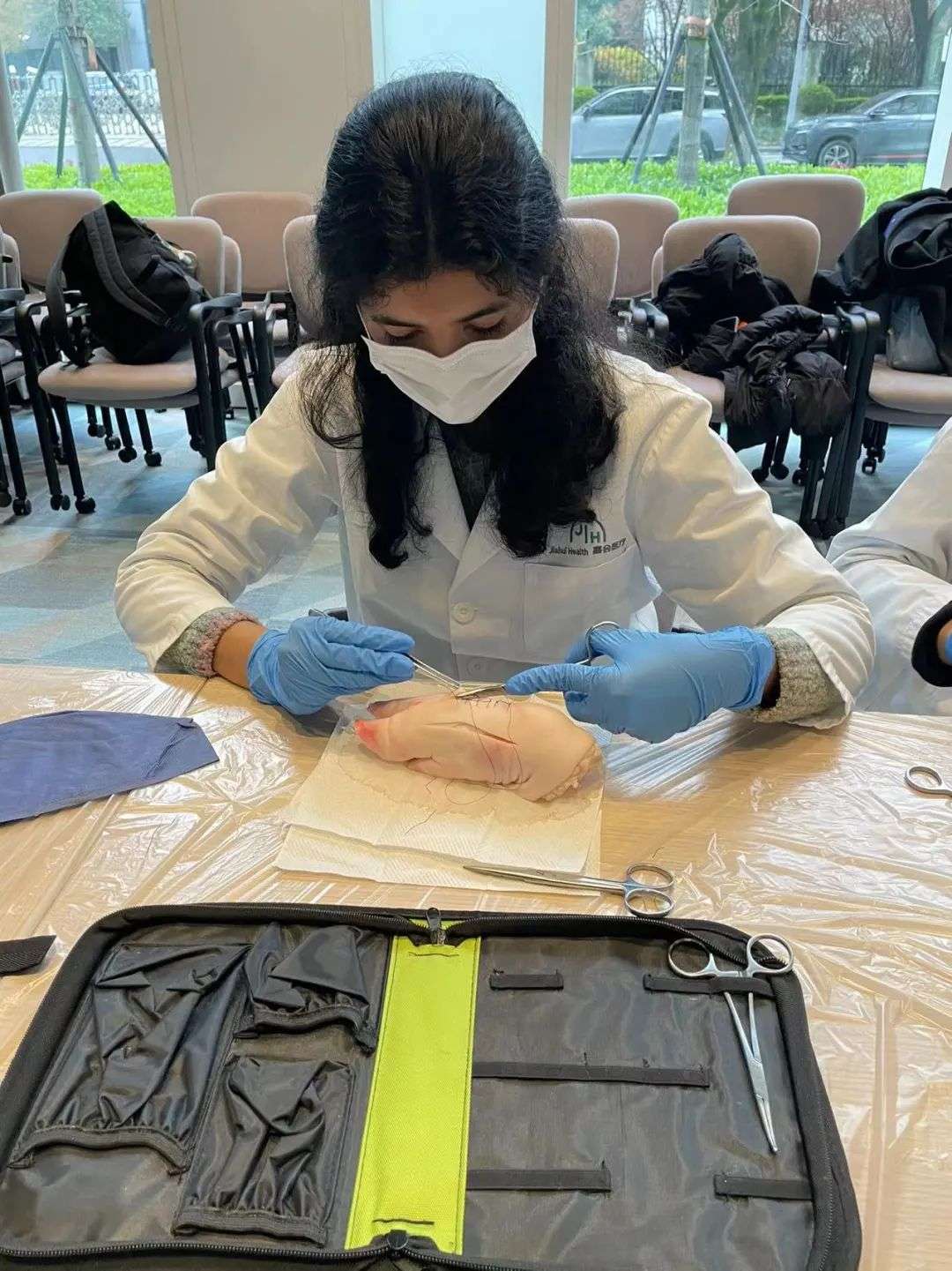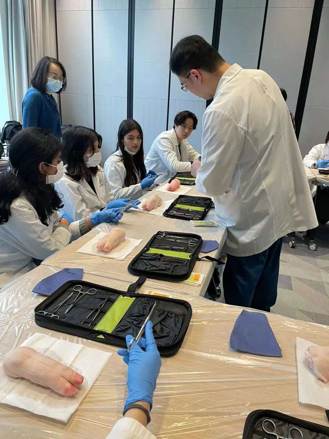 之后学生们有机会尝试缝合,医护人员为他们提供了练习材料,包括合成皮肤和缝线,并指导他们完成缝线的放置过程。学生们能够在医护人员的监督下练习,医护人员提供反馈和建议,帮助他们提高技术。