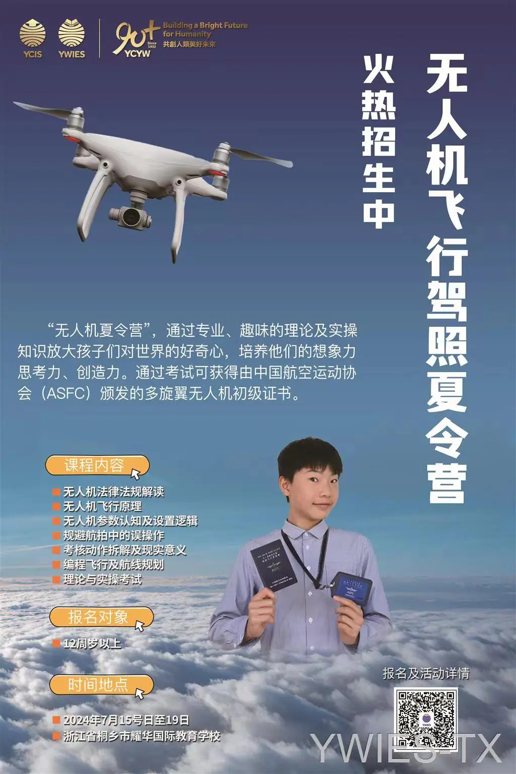 通过专业、趣味的理论及实操知识放大孩子们对世界的好奇心,培养他们的想象力、思考力、创造力,并通过考试获得由中国航空运动协会(ASFC)颁发的多旋翼无人机初级证书。