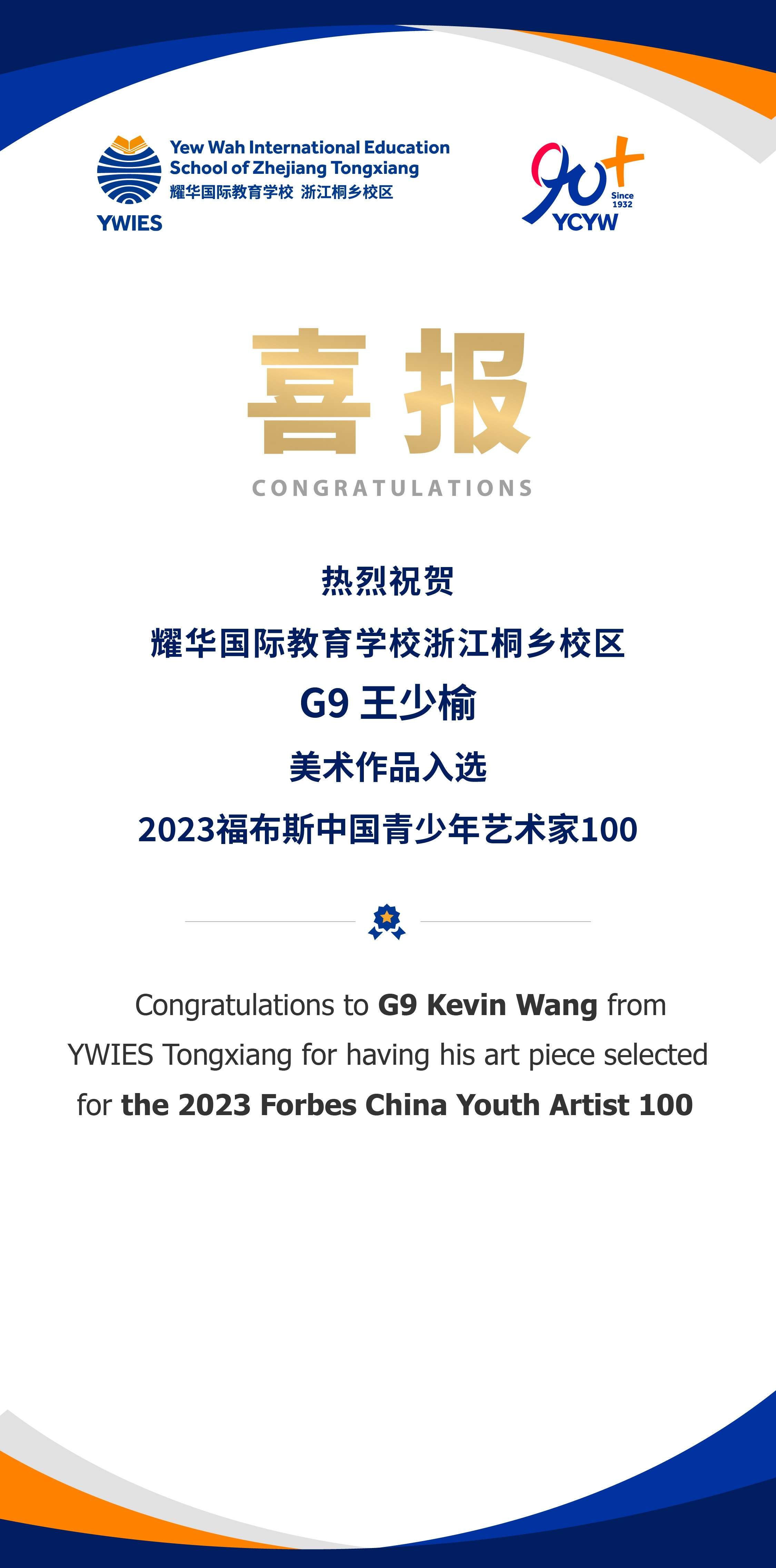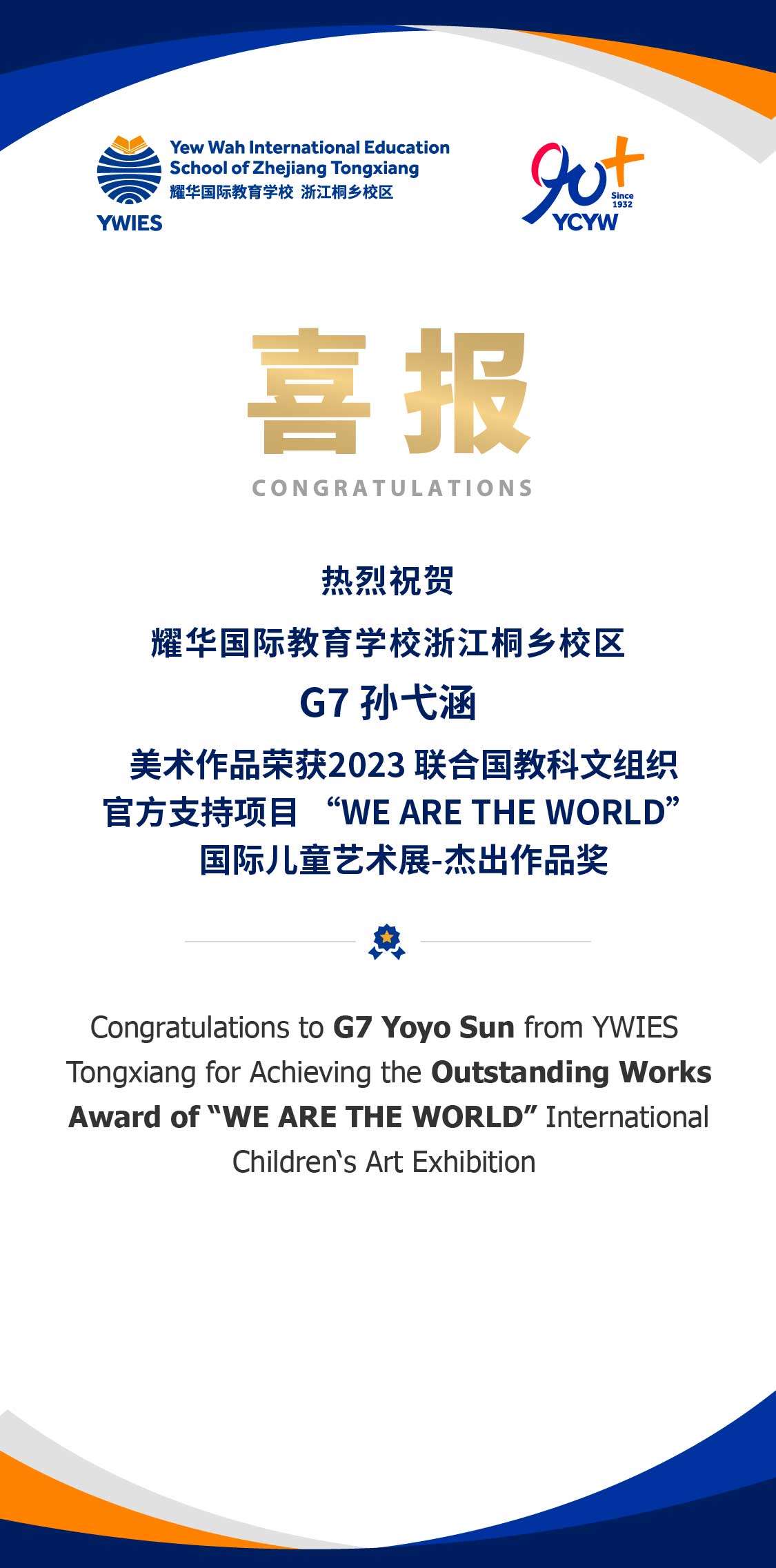 近期,桐乡耀华学子在国内外各大艺术赛事中表现突出,其中七年级孙弋涵和九年级王少榆的学生作品分别入选2023法国卢浮宫 “WE ARE THE WORLD” 国际儿童画展和福布斯中国·青少年艺术家全国巡展。