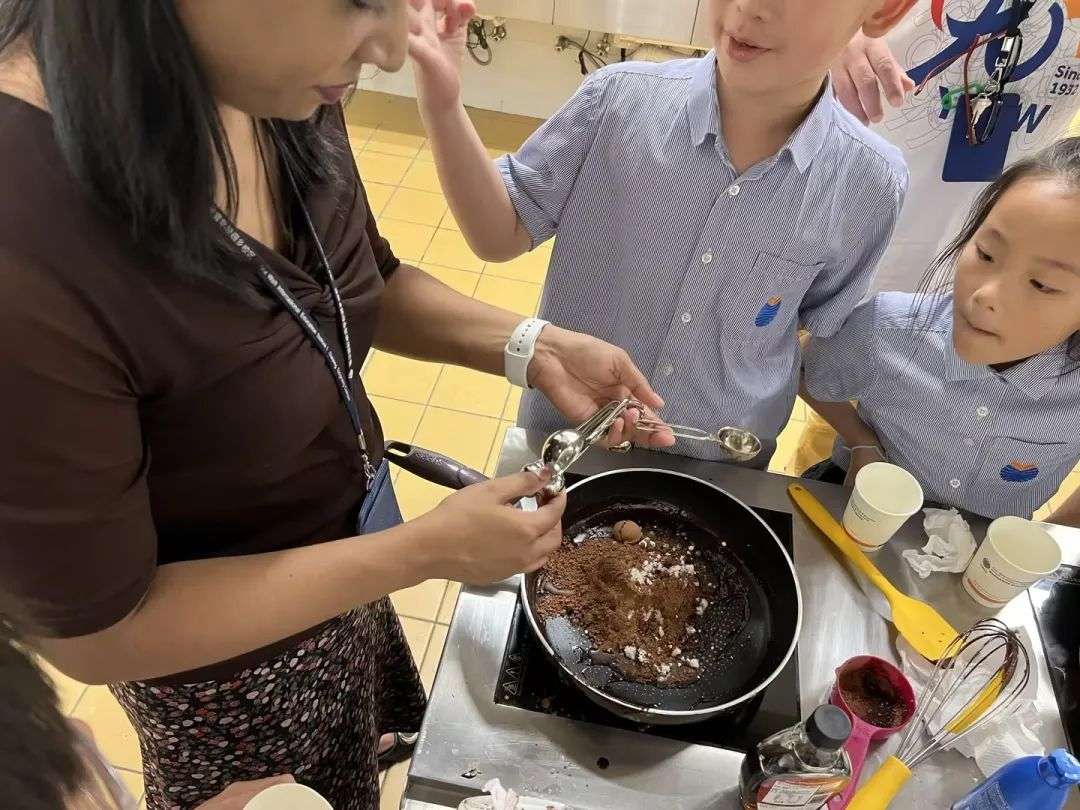 在科学课上,孩子们认识了制作巧克力的原材料及配比,通过品尝不同类型的巧克力,来调整自己的巧克力配方。在老师的带领下,孩子们尝试用不同的原料制作自己的巧克力块。