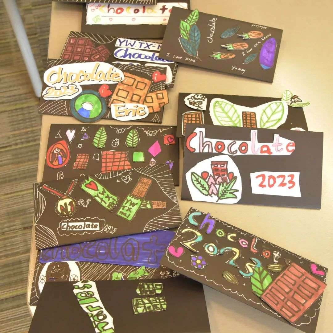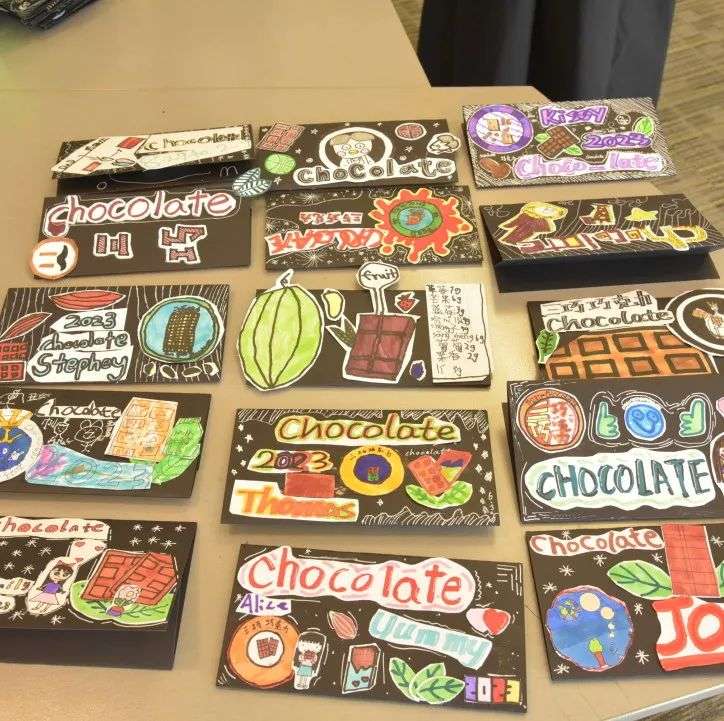 在美术课上,孩子们用不同的材料为他们制作的巧克力设计名字、标志和包装。五彩斑斓且创意十足的包装为美味可口的巧克力更加添彩。