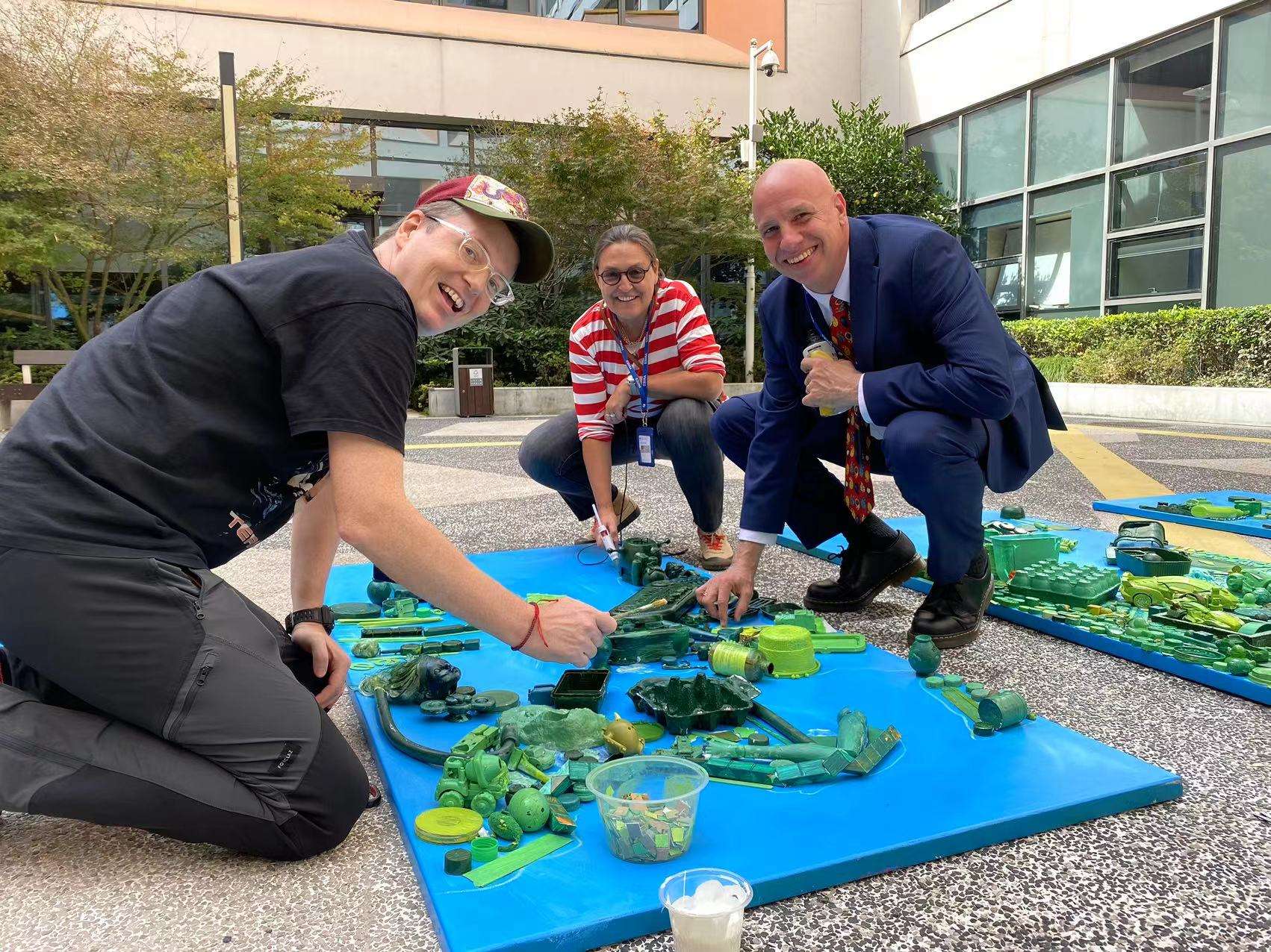 所有的废弃物品和可回收材料都是由学生、教职员工和家长带来的。破损的玩具、瓶盖和废弃容器成为了《绿墙》主要的雕塑元素。El-Marie老师也捐赠了旧画布,指导同学们重新涂上颜料。
