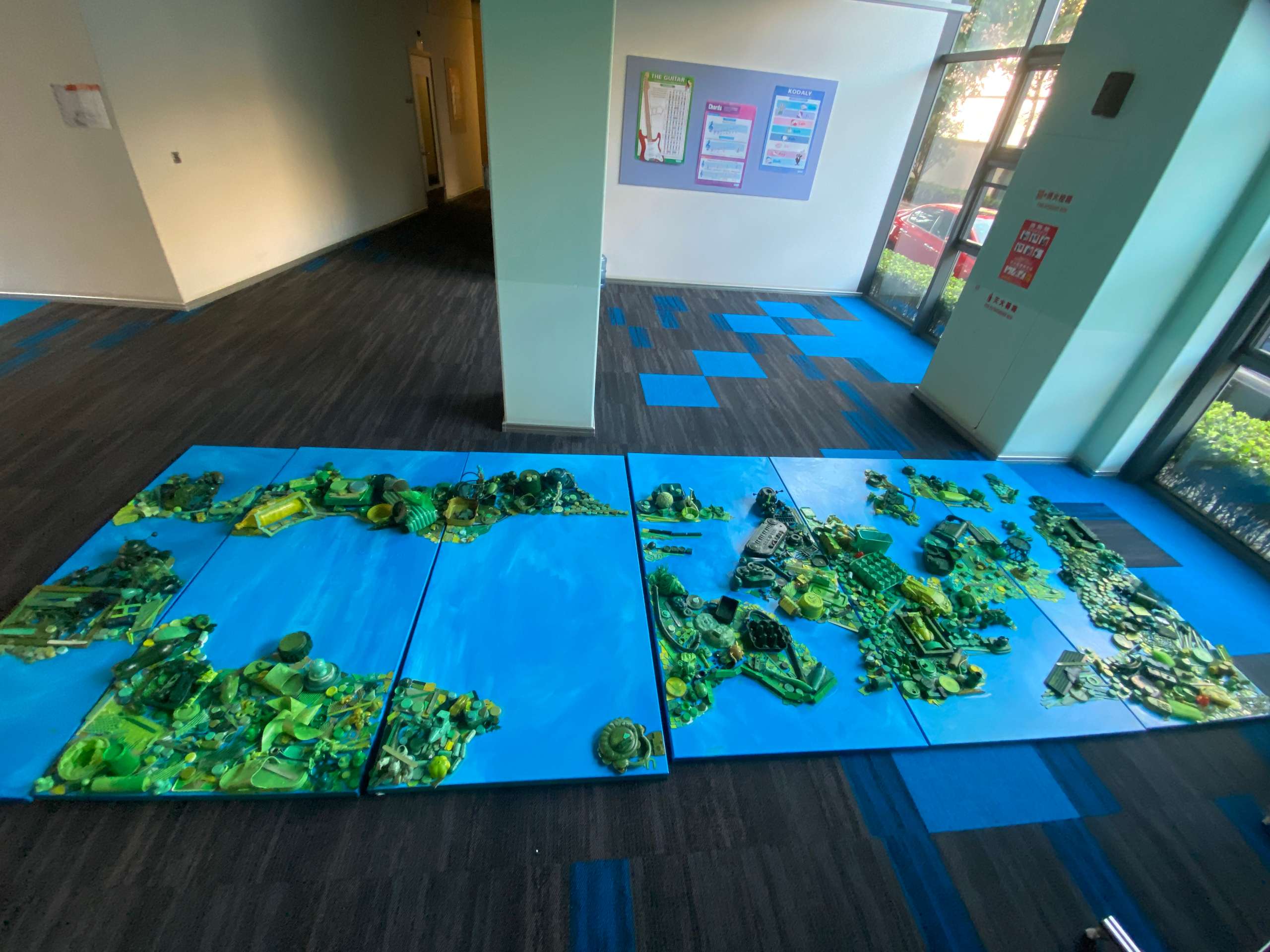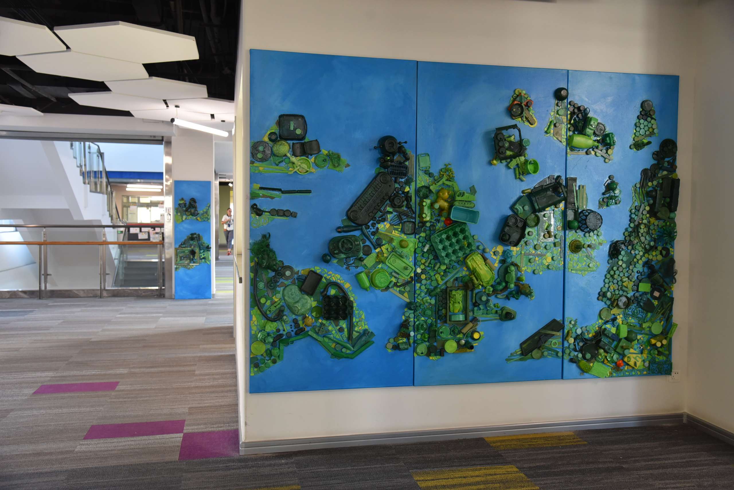 这幅壁画以环保和消费为主题,通过对废旧物品的再次利用,以艺术形式将环保理念传递给大众,号召大众提高对消费主义及其保护环境的意识。“通过这种方式,我们旨在创造一件视觉上令人愉悦的艺术品,为白色墙壁增添了一抹色彩和活力。制作这个作品让我们的学生可以学习艺术的构成要素。我们希望观众在欣赏学生创意的同时,也能深思更深层次的环保理念。” Gabe诠释道。