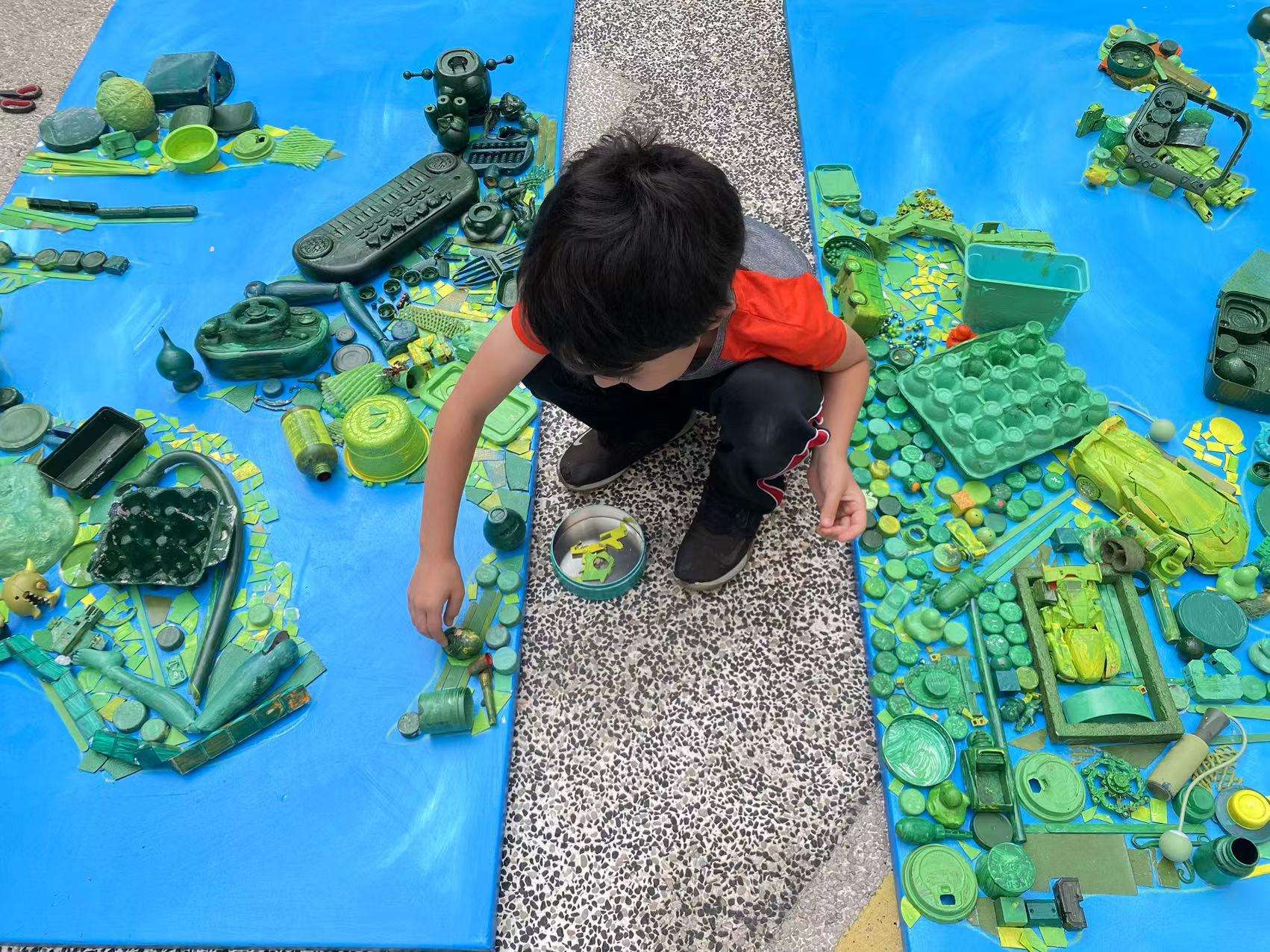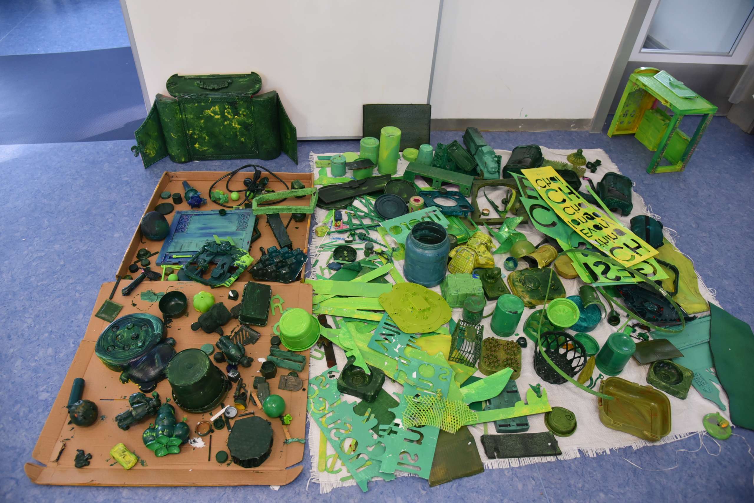旧画布的上色工作完成之后,同学们开始“绿墙”的第二步骤—将废弃物品小部件分批上色。同学们可以挑选自己喜欢的小部件,分批刷上浅绿色、绿色、深绿色以及黄色颜料。