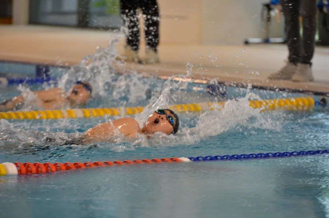 游泳比赛分为小学组和中学组,小学组比赛的项目包括25米自由泳、25米蛙泳和25米戴脚板游,为了增加比赛的趣味性,体育组的老师还特别设置了“水下寻宝”活动,鼓励学生利用所学的游泳技巧控制在水中的平衡,进一步锻炼学生胆量和肺活量。