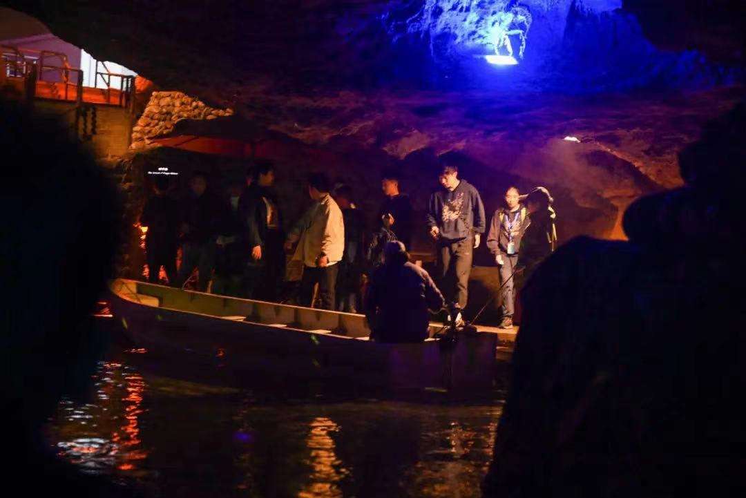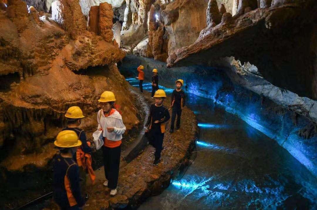 同学们带上安全装备跟随讲解老师进行深度地心科考,探索溶洞包含:石灰岩、边石坝、石柱、钟乳石、石幔和石笋等自然奇观。溶洞里清澈的山泉水流淌不断,有时溶岩上的水滴突然滴在同学们的脸上让人心跳不已,洞内光怪陆离,在光影和熔岩美妙的结合下更是让同学们感叹大自然的鬼斧神工。