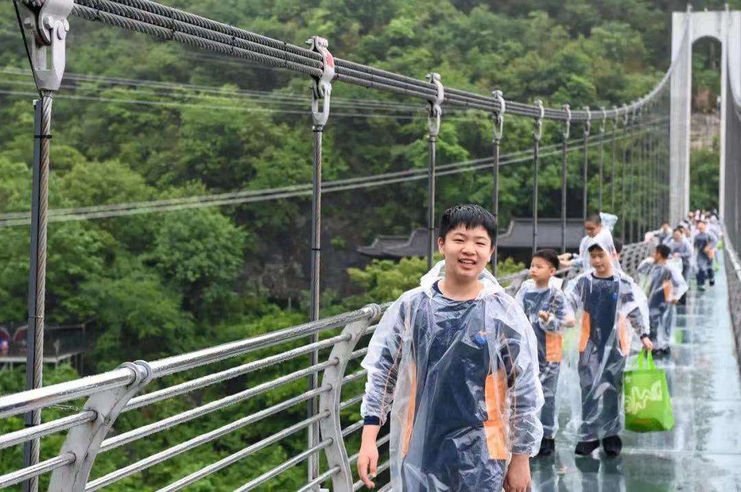 凌云天桥长300余米,相对地面高度约150米,同学们踏走在玻璃桥上,井然有序,欢声笑语,大家既紧张又激动,最终伴随着欢乐的笑声所有同学走完玻璃天桥,站在桥上,有如云端漫步,放眼望去,远山近景皆尽收眼底,一览无遗。