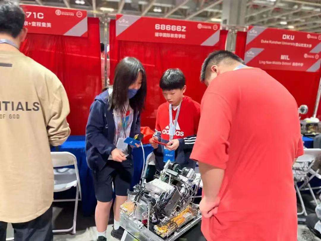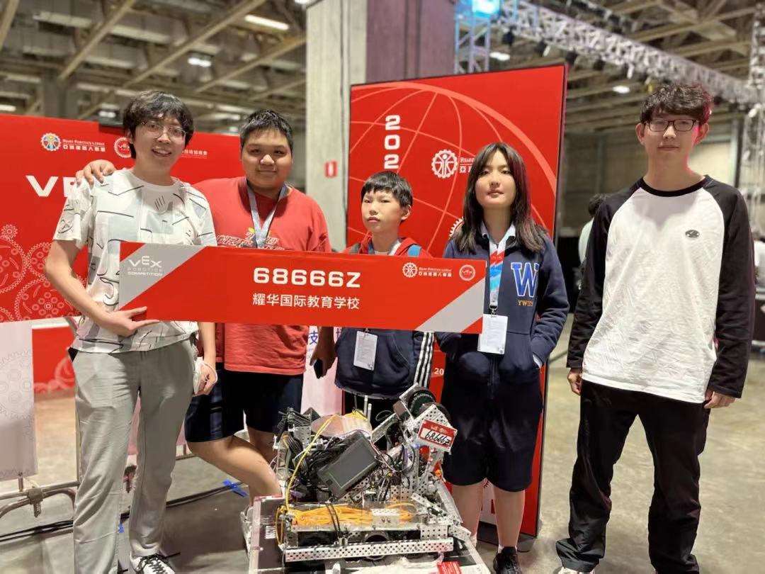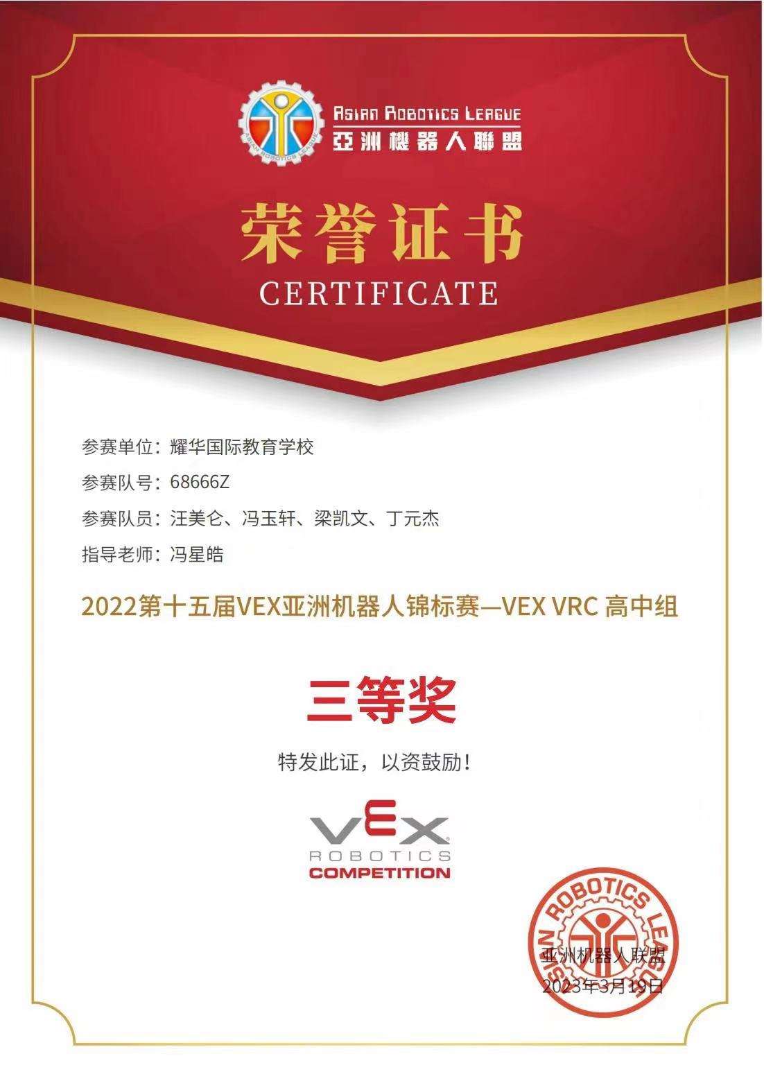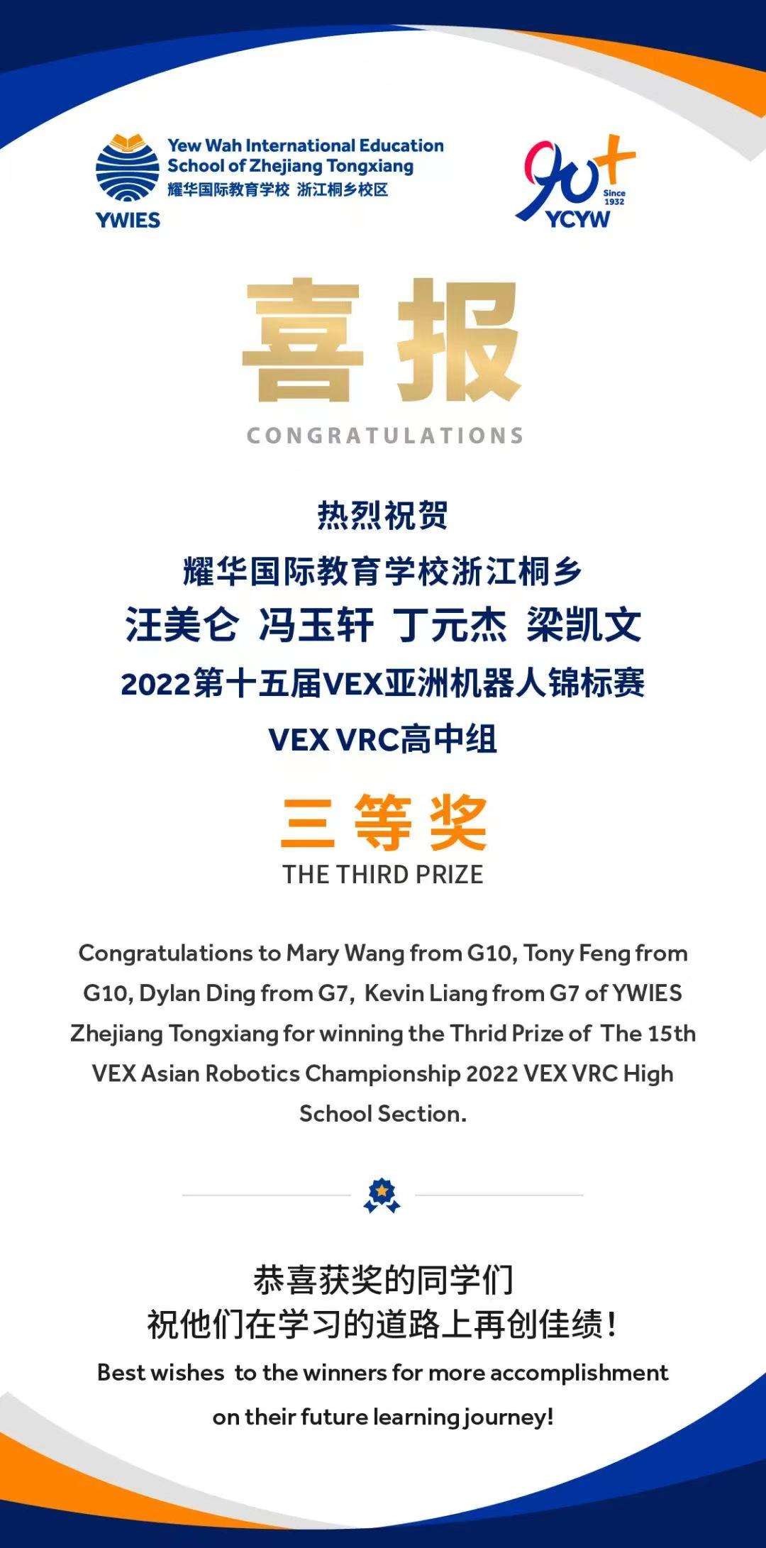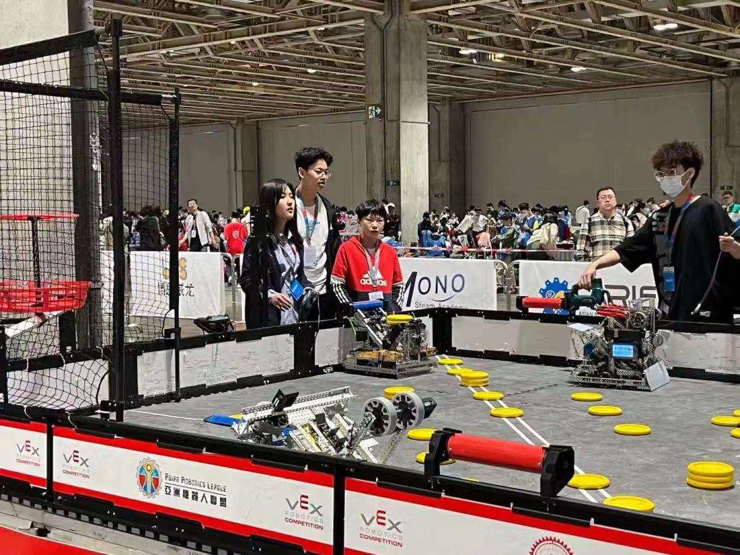 近日,在刚刚结束的由亚洲机器人联盟主办的2022第十五届VEX亚洲机器人锦标赛中我校G10汪美仑(Mary)、G10冯玉轩(Tony)、G7丁元杰(Dylan)、G7梁凯文(Kevin)在科学组冯星皓(Theo)老师和袁力(Lily)老师的带领下,经过三天的“鏖战”,最终再次获得VEX VRC高中组三等奖!